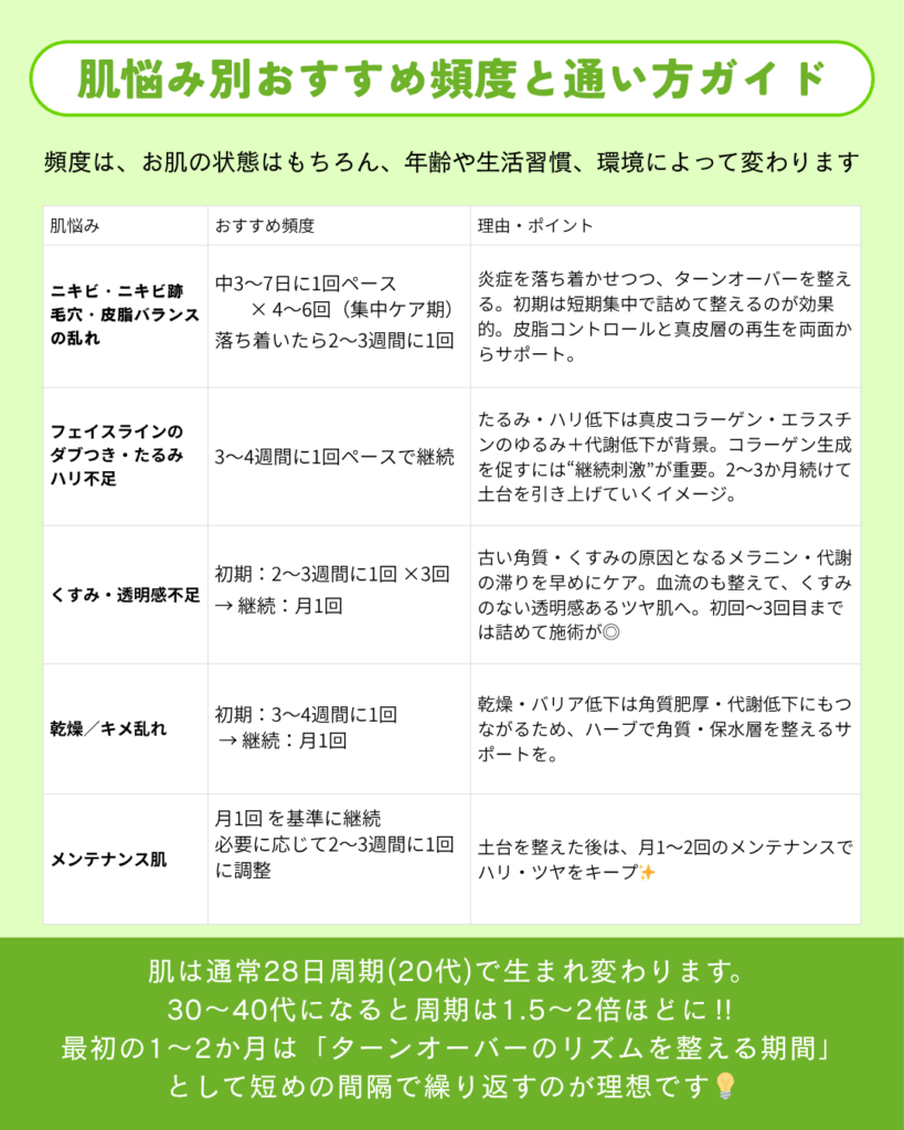 ハーブトリートメントの頻度は、お肌の状態はもちろん、年齢や生活習慣、環境によって変わります!