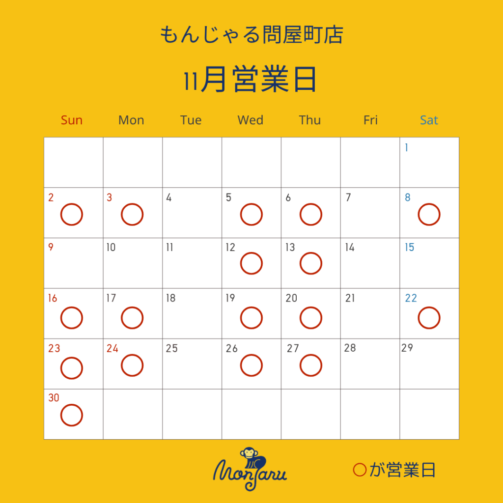 もんじゃる問屋町店の営業日に